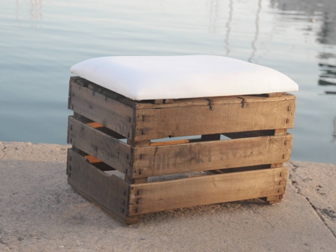 Puffs de cajas de fruta antigua de 40/50 años de antiguedad restaurada y acondicionadas. Se utilizaban en labores agrícolas para recoger y trasportal los cultivos, nos pareció una hermosa idea poder darle una segunda vida aprovechando la resistencia del material. El asiento es de polipiel Náutica para poder disfrutar de un asiento cómodo. El Barniz especial y la polipiel lo hacen ideal para utilizar en exterior.